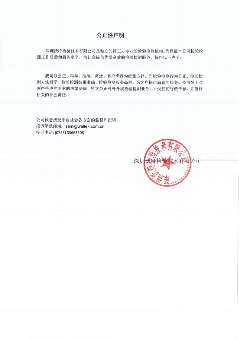 公正性聲明(深圳市沃特測試技術(shù)服務(wù)有限公司)