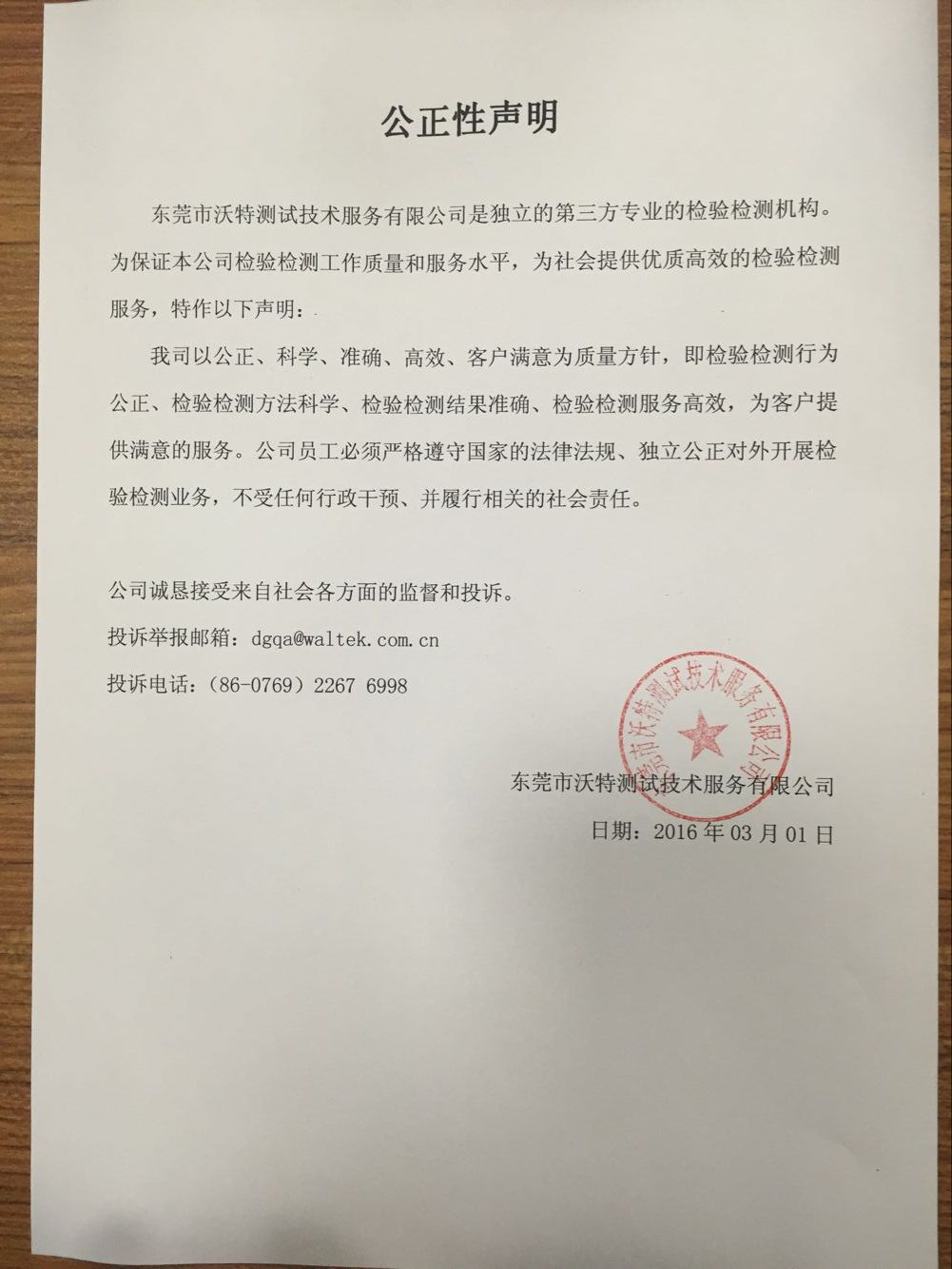 公正性聲明(東莞市沃特測試技術(shù)服務(wù)有限公司)