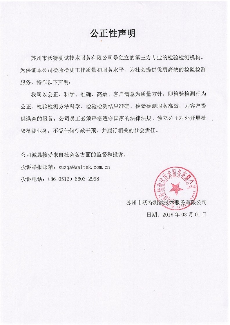 公正性聲明(蘇州市沃特測試技術(shù)服務(wù)有限公司)