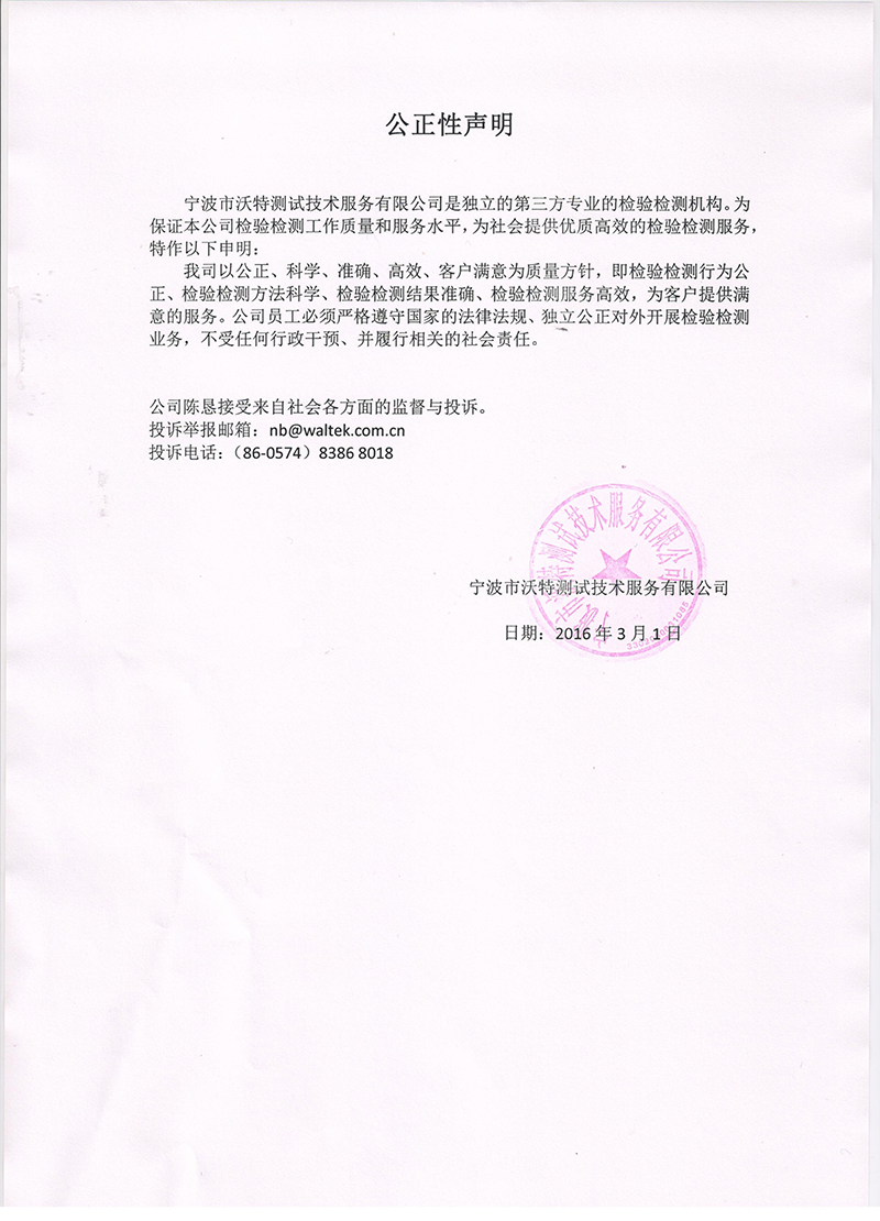 公正性聲明(寧波市沃特測試技術(shù)服務(wù)有限公司)