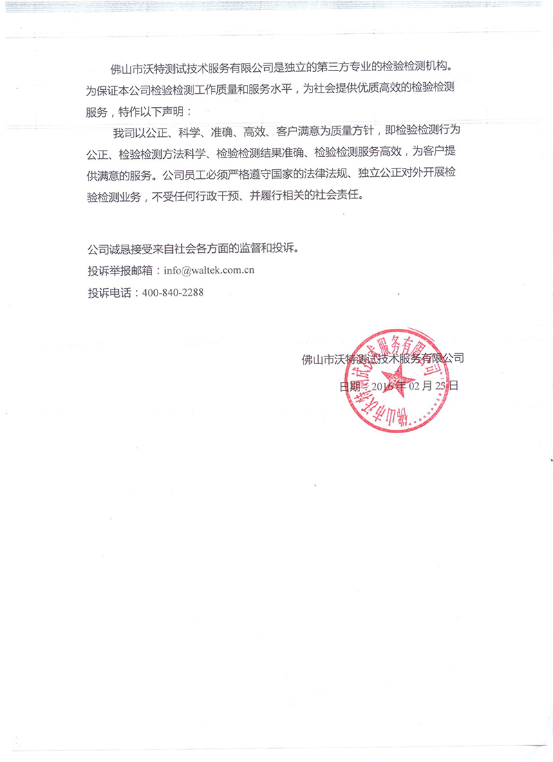 公正性聲明(佛山市沃特測試技術(shù)服務(wù)有限公司)