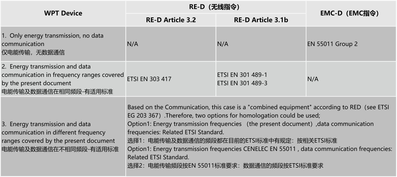 無(wú)線充電設(shè)備(WPT)如果有電能傳輸也有數(shù)據(jù)通信(無(wú)論是否工作在相同頻段)都需要按照RED要求來(lái)認(rèn)證,RF標(biāo)準(zhǔn)為 ETSI EN 303 417。如果只有電能傳輸無(wú)數(shù)據(jù)通信可以只評(píng)估EMC要求,遵從EN 55011標(biāo)準(zhǔn)執(zhí)行。
