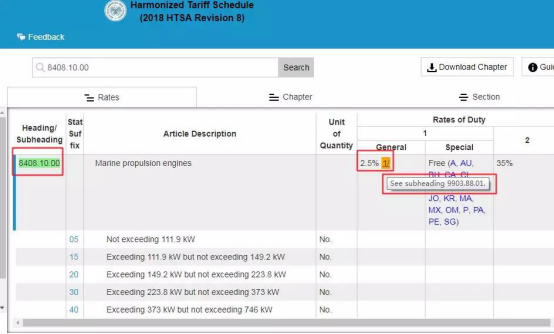 以在美國(guó)加征范圍內(nèi)的稅“8408.10.00船用推進(jìn)發(fā)動(dòng)機(jī)”為例,這項(xiàng)產(chǎn)品被列入了第一批340億美元的加稅清單中,此前它的進(jìn)口稅率在“General”處顯示的是2.5%。但是現(xiàn)在,它的“General”稅率后面跟著一個(gè)“1”,鼠標(biāo)靠近后顯示“See subheading 9903.88.01”。