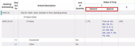 搜索頁面中的RatesofDuty1,左邊General為一般進(jìn)口稅率,右邊Special是美國(guó)對(duì)特定國(guó)家征收的進(jìn)口稅率。