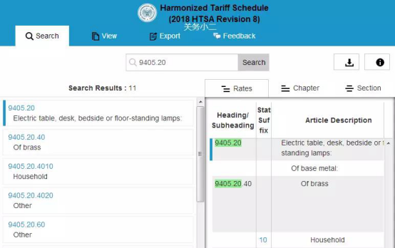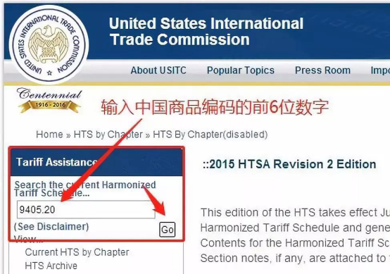 進(jìn)入美國(guó)國(guó)際貿(mào)易委員會(huì)官網(wǎng)(http://www.usitc.gov/tata/hts/bychapter/index.htm),在TariffAssistance一欄的SearchthecurrentHarmonizedTariffSchedule...搜索框中輸入中國(guó)HSCODE的前六位數(shù),如臺(tái)燈940520****。