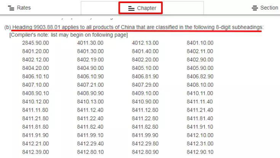 再往下閱讀,在“Chapter”下文中列出了歸在“9903.88.01”項(xiàng)下的編碼。
