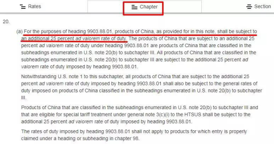 至于上述的“note 20”是什么意思呢?我們可以在“Chapter”頁面下找到它,這里更詳細(xì)地解釋了:“note 20”是針對(duì)中國(guó)產(chǎn)品加稅的一個(gè)說明,25%是額外征收的稅率。