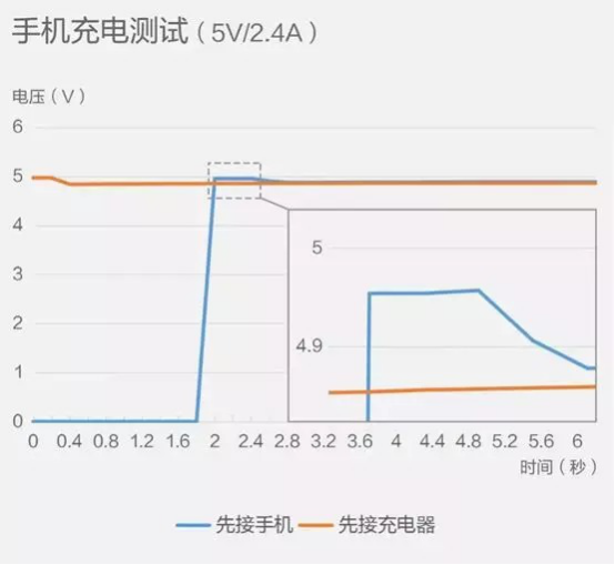 測試表明:[先接手機再接充電器],上電瞬間手機接收到的電壓有所上升,超過[先接充電器再接手機]時平穩(wěn)的電壓水平。這就是日常生活用電過程中常見的“電涌”現(xiàn)象。