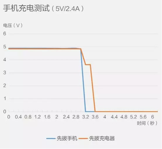 測試表明:[先拔充電器再拔手機],此時電壓出現(xiàn)明顯的波動,那是因為先拔充電器,部分殘留在充電器里的電壓還是會對手機造成影響。而[先拔手機再拔充電器],則不會出現(xiàn)此類情況。