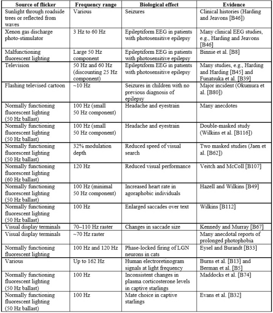以上標(biāo)準(zhǔn)都參考了IEEE Standard PAR1789。這份標(biāo)準(zhǔn)還很貼心地給出了一些實(shí)驗(yàn)記錄(如下),表明日常那些常見光的閃爍對人體的影響。