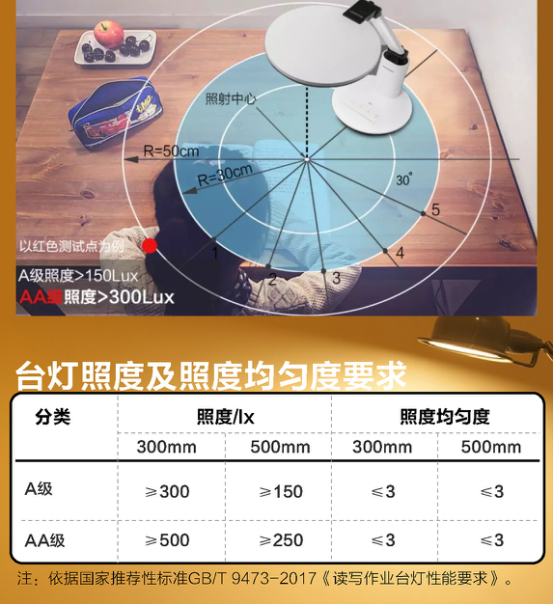 國標(biāo)對臺燈的照度及均勻度作出了要求,分為A和AA兩個(gè)等級。AA級在照度上比A級的要求更高。