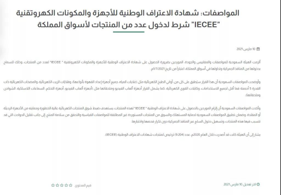 3月10日,沙特阿拉伯標準局 (SASO) 在其官網(wǎng)公布最新消息稱:自2021年7月1日起擴大IECEE認證管控范圍;在管控列表上的產(chǎn)品及相似敘述的產(chǎn)品都需要申請取得SASO IECEE Recognition Certificate (SIRC證書) 。