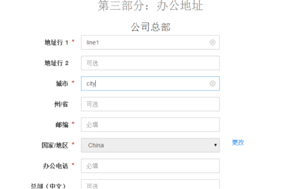 注意:辦公地址的填寫中除去總部與個人地址其余信息必須填寫英文!