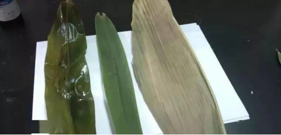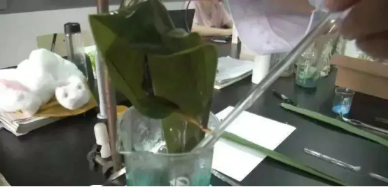 把粽葉在水里稍微煮一下,觀察湯水的顏色。新鮮的粽葉煮出來的水,明顯就是一種枯黃的感覺;而硫酸銅處理過的粽葉泡完水之后,實(shí)際上是硫酸銅的綠色。