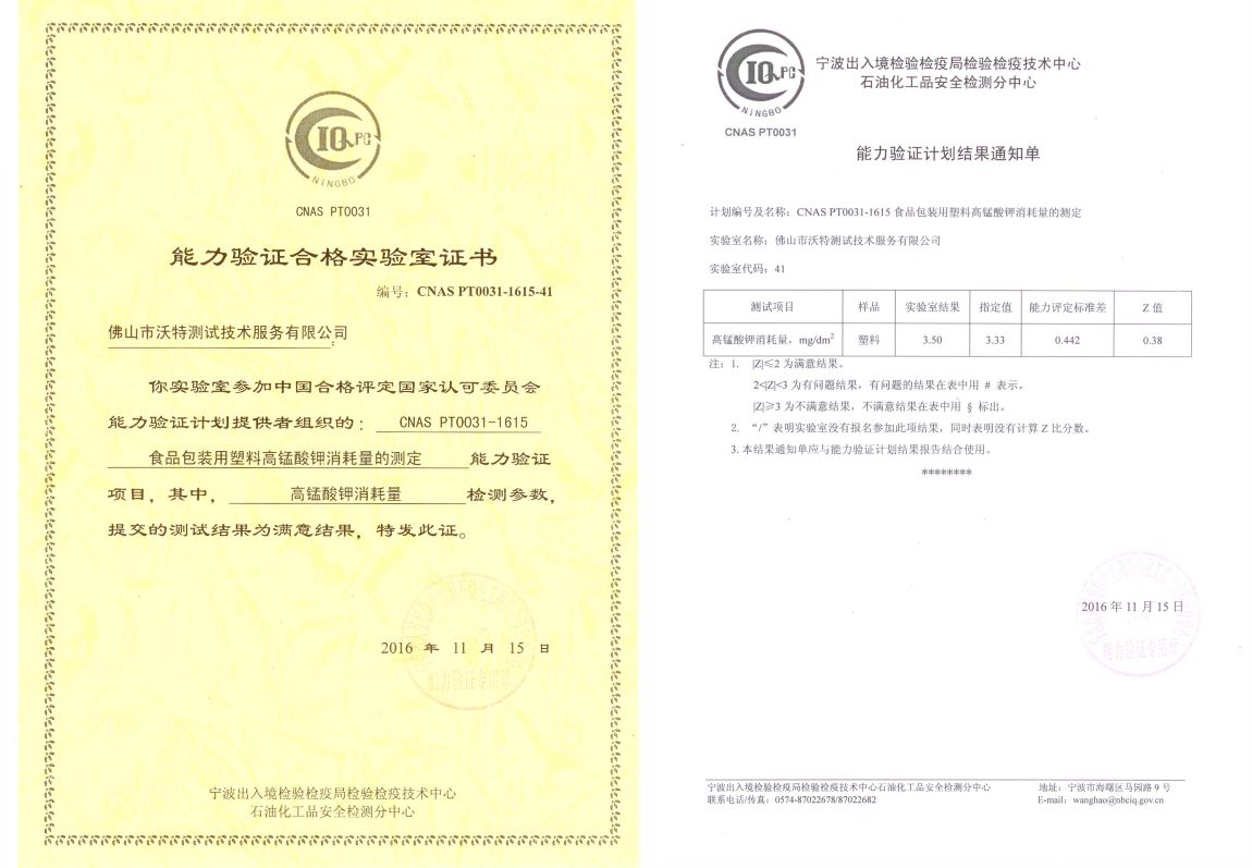 2016年11月15日,佛山沃特化學(xué)實(shí)驗(yàn)室參加由寧波出入境檢驗(yàn)檢疫局組織的CNAS PT0031-1615-41 食品包裝用塑料高錳酸鉀消耗量的測定的能力驗(yàn)證,并取得了滿意的結(jié)果。