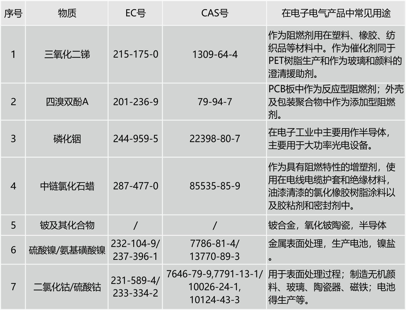 7項(xiàng)評(píng)估物質(zhì)信息如下: