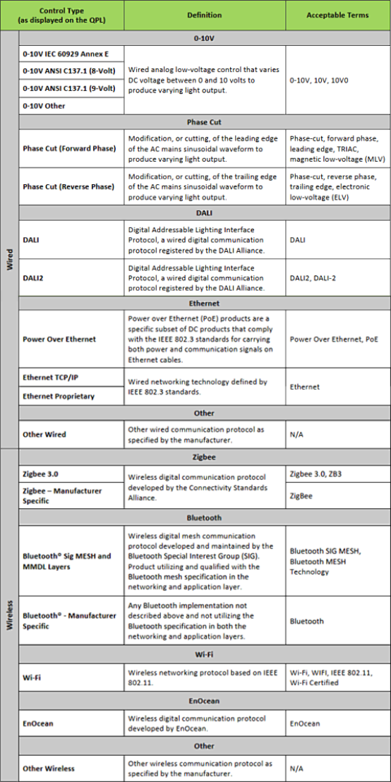 (2) 此外針對調(diào)光和控制功能、控制屬性、接受/傳輸硬件這些產(chǎn)品信息描述,DLC也要求提供相關(guān)的控制標(biāo)準/協(xié)議(從下表中)。