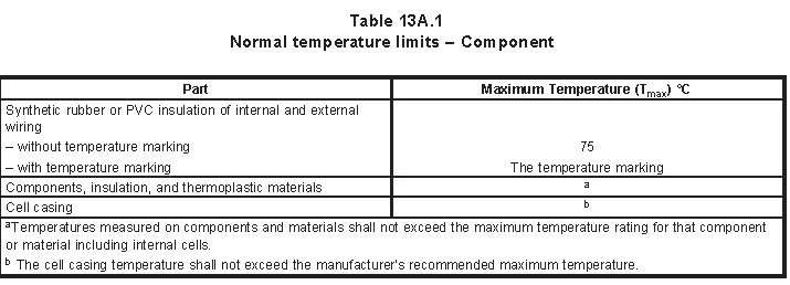 輸出放電溫升測(cè)試:用電阻做負(fù)載, 把放電電流控制在過流保護(hù)不動(dòng)作情況下最大放電電流直到熱穩(wěn)定或者電壓將至最低電壓其中一個(gè)現(xiàn)象并且不能超過下圖表的溫度限值。