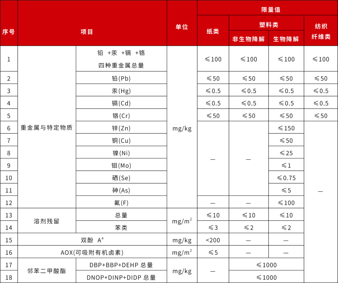 標準規(guī)定的紙類、塑料類和紡織纖維類快遞包裝中重金屬和特定物質限量要求如下表1所示。