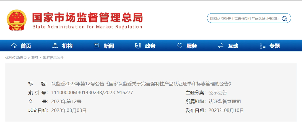 據(jù)國家市場監(jiān)管總局官網(wǎng)消息,自2024年1月1日起,新版《強制性產(chǎn)品認證證書管理要求》《強制性產(chǎn)品認證標志管理要求》正式實施,CCC認證全面施行電子認證證書。