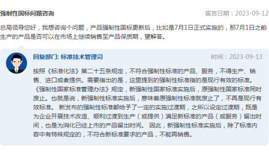 強制性國標(biāo)問題咨詢:總局領(lǐng)導(dǎo)您好,我想咨詢個問題,產(chǎn)品強制性國標(biāo)更新后,比如是7月1日正式實施的,那7月1日之前生產(chǎn)的產(chǎn)品是否可以在市場上繼續(xù)銷售至產(chǎn)品保質(zhì)期,望解答。