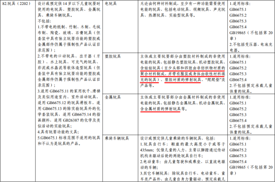 此外,根據(jù)該公告的附件《強(qiáng)制性產(chǎn)品認(rèn)證目錄描述與界定表(2020年修訂)》的第82項(xiàng),玩具被劃分為電玩具、塑膠玩具、金屬玩具、乘騎車輛玩具4種產(chǎn)品,取消了“彈射玩具”和“娃娃玩具”這兩個(gè)類別。