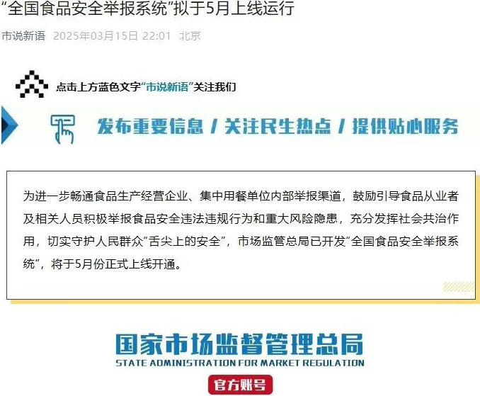 據(jù)市說(shuō)新語(yǔ)微信公眾號(hào)消息,市場(chǎng)監(jiān)管總局已開(kāi)發(fā)“全國(guó)食品安全舉報(bào)系統(tǒng)”,將于5月份正式上線開(kāi)通。