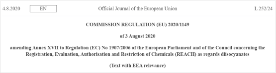 2020年8月4日,歐盟官方公報發(fā)布關于歐盟REACH法規(guī)附件XVII的修訂法規(guī)(EU) 2020/1149,新增了第74條目對二異氰酸酯 (Diisocyanates)的限制。