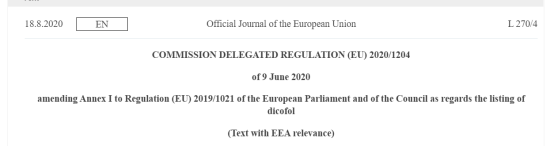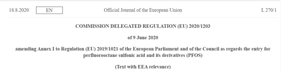 2020年8月18日,歐盟官方公報發布 (EU) 2019/1021(歐盟POPs法規)的修訂指令(EU) 2020/1203和(EU) 2020/1204。分別修訂法規附件I中關于全氟辛烷磺酸及其衍生物(PFOS)的豁免,新增三氯殺螨醇的限制要求,并自發布之日起第20天生效。