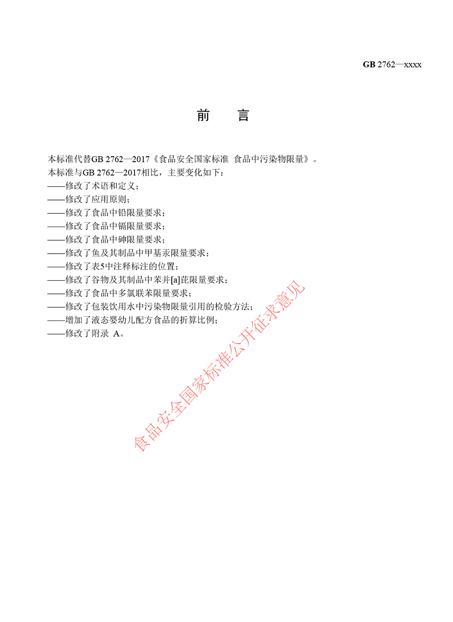 GB2762《食品安全國(guó)家標(biāo)準(zhǔn) 食品中污染物限量》(征求意見(jiàn)稿)主要變化