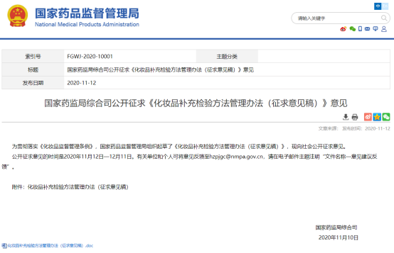 11月12日,國家藥監局綜合司就《化妝品補充檢驗方法管理辦法(征求意見稿)》公開征求意見。公開征求意見的時間是2020年11月12日—12月11日。