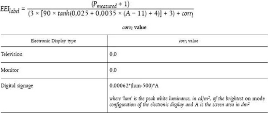 能效指數(shù)的計(jì)算公式如下:其中,Pmeasured是on mode模式下測(cè)得的消耗功率(W),A是屏幕面積(dm2),corr是修正因數(shù)(不適用于ABC功能加權(quán)的OLED電子顯示器是10,其他的是0)。