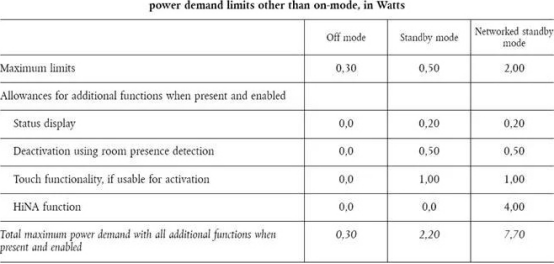 電子顯示器關(guān)機(jī)模式、待機(jī)模式和網(wǎng)絡(luò)待機(jī)模式的功耗,不能超過(guò)如下限值: