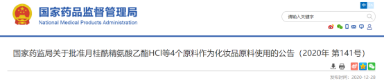 2020年12月28日,國家藥監局根據相關規定且經專家委員會審核,批準月桂酰精氨乙酯HCI等4個原料作為化妝品原料使用,這也是《化妝品監督管理條例》頒布后國家藥監局公布的首批批準的化妝品新原料。該批原料此前已于2020年12月2日由國家藥監局擬批準作為化妝品用原料向社會公開征求意見,并要求在12月10日前提交反饋。