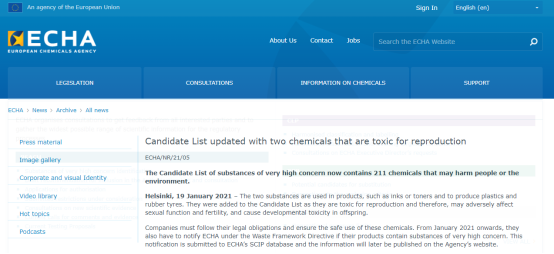 2021年1月19日,歐洲化學品管理局(ECHA)在其官網公布兩項SVHC物質,并正式加入到SVHC候選物質清單。截止到目前,SVHC候選物質清單總共211項。