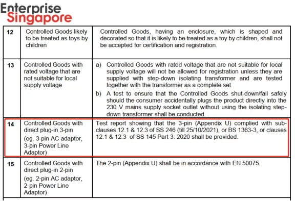 隨著新加坡適配器標準SS 145-3:2020《13A插頭、插座、適配器和連接單元的規范-第3部分》的發布,2020年10月26日,新加坡企業發展局官方發布了新加坡保障消費者(安全規定)注冊計劃最新版本V.9,其中,對帶有直插式三插的相關產品有新的法規要求。
