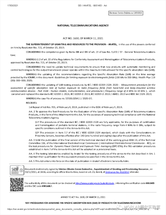 2021年3月12日,巴西通訊管理局ANATEL發布了新的第1630號法案 - 評估電信產品比吸收率(SAR)的測試程序,以取代2018年2月8日發布的第955號法案。新法案主要更改的內容如下: