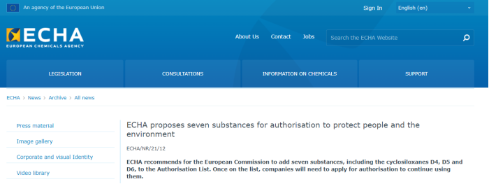 2021年4月14日,歐洲化學品管理局(ECHA)官網發(fā)布有關提議歐盟REACH附錄14授權物質清單新增7項授權物質的通知,其中包括環(huán)硅氧烷D4,D5、D6等可大量生產且用途廣泛的化學物質。此外,該7項物質均已于2018年6月27日作為第19批納入了SVHC清單。