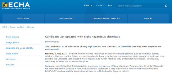 2021年7月8日,ECHA正式將第二十五批8項(xiàng)公眾評議物質(zhì)加入SVHC候選清單中。目前,REACH法規(guī)SVHC候選清單總共219項(xiàng),合計(jì)25批。
