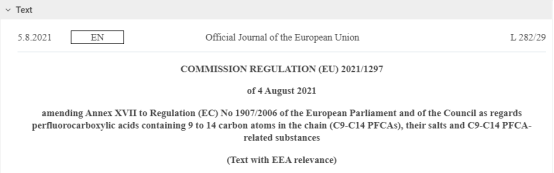 2021年8月5日,歐盟官方公報在其官網(wǎng)上發(fā)布了修訂法規(guī)(EU) 2021/1297,本法規(guī)修訂了REACH附件XVII限制物質(zhì)清單第68條,將已移除至POPs法規(guī)的PFOA替換為全氟羧酸C9-C14 PFCA及其鹽類和相關(guān)物質(zhì)。本法規(guī)自其在歐盟官方公報上發(fā)布之日起第20天生效。本法規(guī)直接適用于歐盟所有成員國。