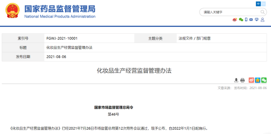 2021年8月6日,國家市場監(jiān)督管理局在其官網(wǎng)發(fā)布了《化妝品生產(chǎn)經(jīng)營監(jiān)督管理辦法》(下稱《辦法》),并于2022年1月1日起正式施行。