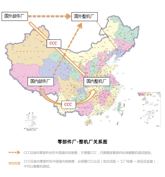 國(guó)內(nèi)CCC零部件廠 + 國(guó)內(nèi)整機(jī)廠 = 要CCC認(rèn)證(型式試驗(yàn) + 工廠檢查 + 獲證后監(jiān)督)