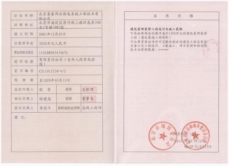 我公司已有資質:建筑智能化系統設計專項甲級、建筑智能化工程專業承包貳級、機電設備安裝工程專業承包叁級、裝飾裝修設計施工一體化貳級資質、安防工程企業貳級資質等相關專業設計施工資質。