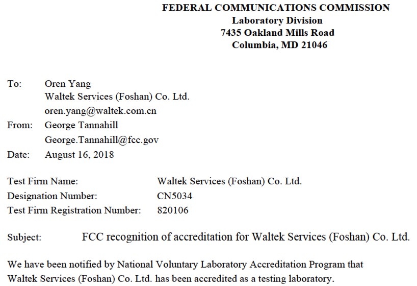 在七夕的今天,我們又收到了美國聯(lián)邦通訊委員會FCC的通知,佛山沃特EMC實驗室被FCC認(rèn)可(Registration No.: 820106)。是的,確認(rèn)過眼神,這是一份七夕的禮物。