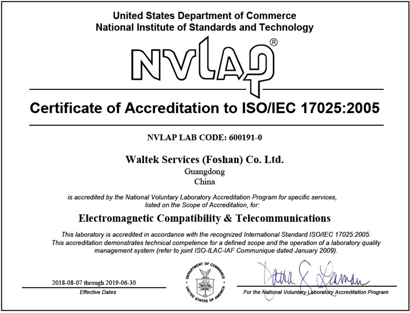 繼8月3日佛山沃特能效實驗室獲得美國國家實驗室自愿認(rèn)可程序NVLAP認(rèn)可,佛山沃特EMC實驗室在8月7日也取得NVLAP認(rèn)可(Lab Code:600191-0)。