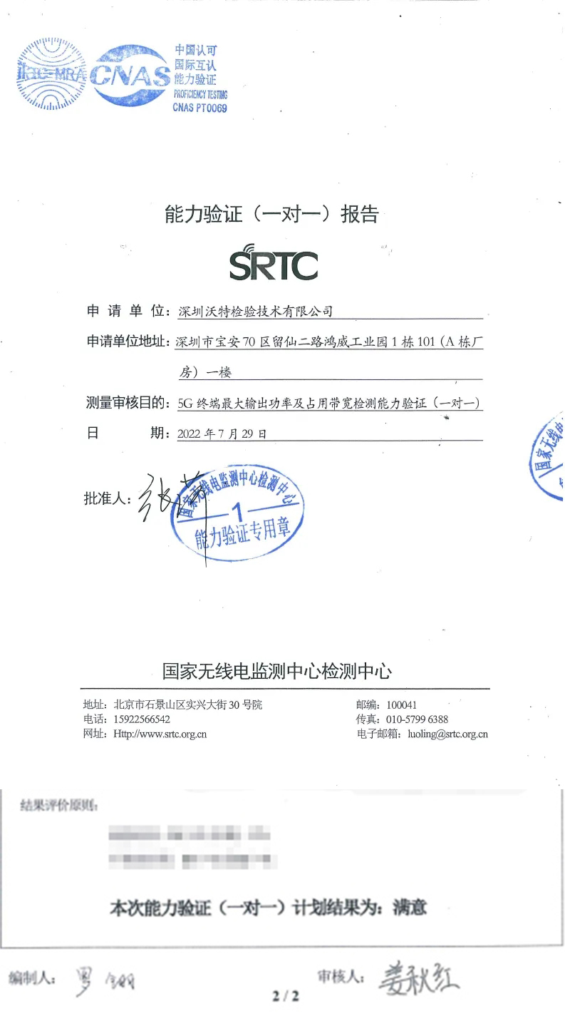 日前,沃特檢驗集團旗下深圳沃特檢驗技術有限公司參加了由國家無線電監(jiān)測中心檢測中心(PTP證書號:CNAS PT0069)組織實施的“5G終端最大輸出功率及占用帶寬檢測”能力驗證計劃,最終結果為“滿意”。