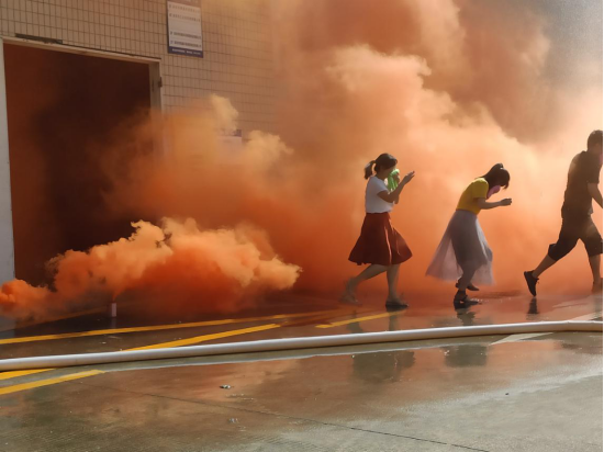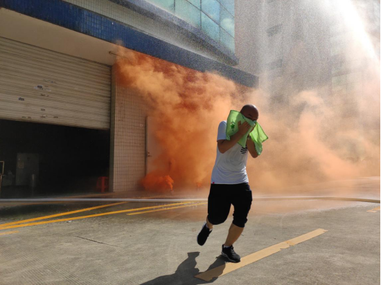 當聽到警報聲,事故樓層內(nèi)的人員在疏散組的引導下,用濕毛巾捂住口鼻,彎著腰,緊張有秩序地從安全路線撤離,向安全區(qū)域集中;