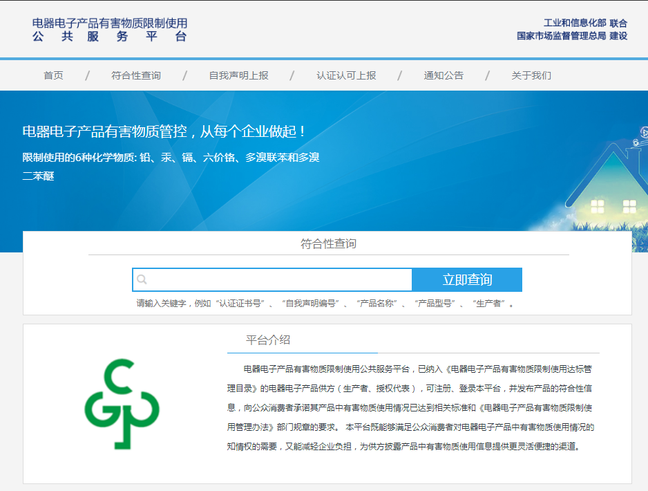 公共服務(wù)平臺統(tǒng)一管理電器電子產(chǎn)品有害物質(zhì)限制使用合格評定信息、公布合格評定結(jié)果,具有合格評定信息報送、公開查詢、統(tǒng)計分析、信息發(fā)布等功能。