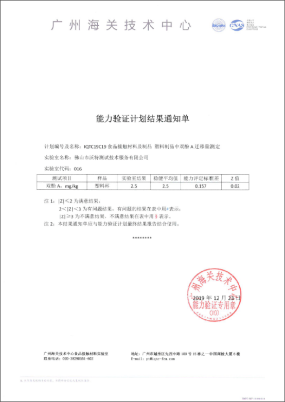 佛山沃特參加IQTC19C19食品接觸材料及制品塑料制品中雙酚A遷移量的測(cè)定能力驗(yàn)證獲得滿意結(jié)果