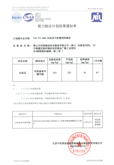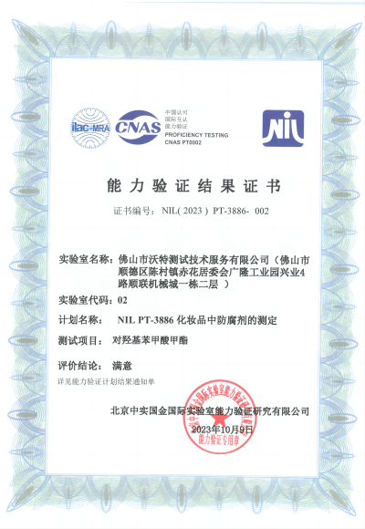 佛山沃特參加NIL PT-3886化妝品中防腐劑的測定 獲“滿意”結(jié)果